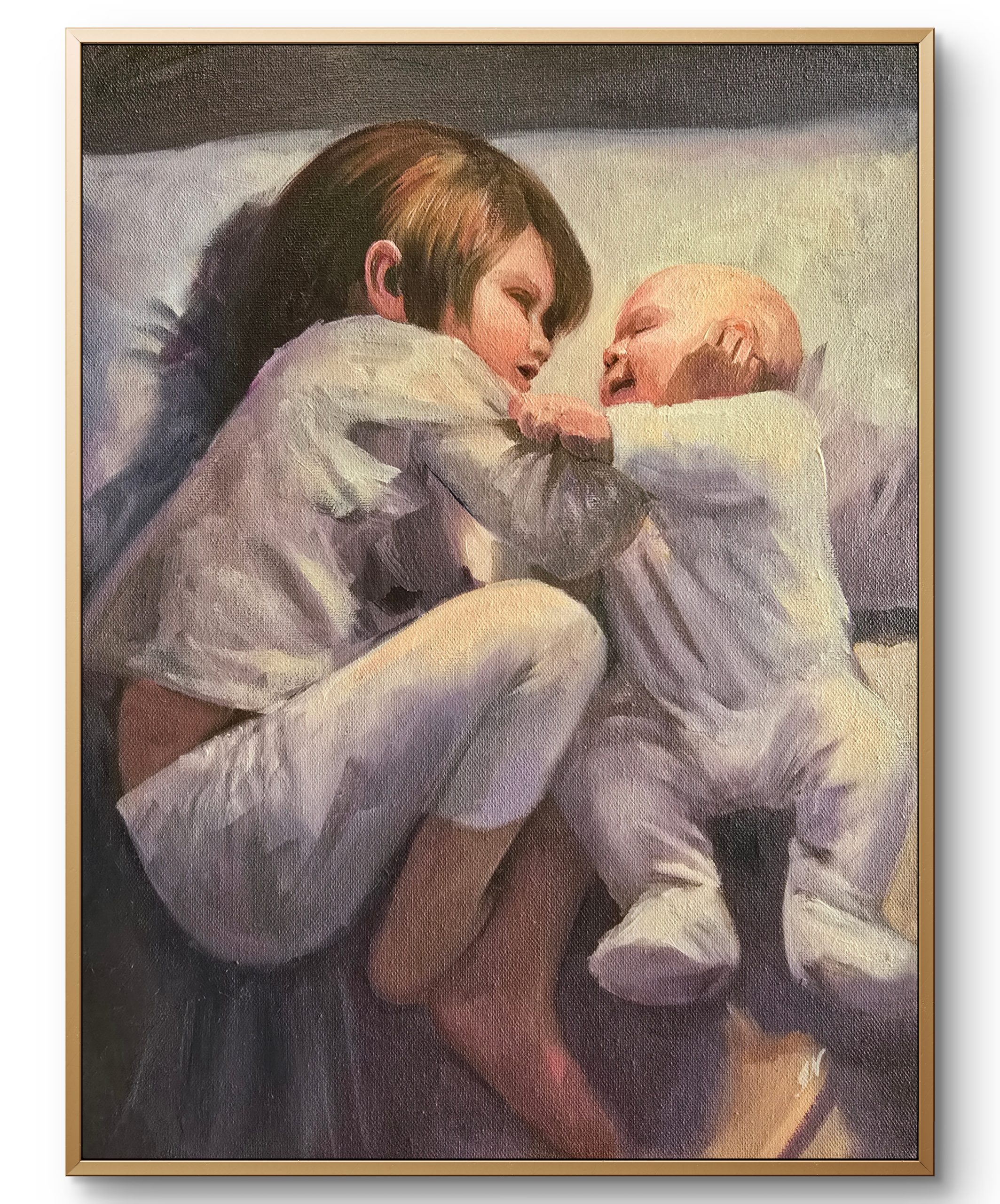 Little Guardian captures a tender, almost sacred moment—an older sibling instinctively stepping into care, curiosity, and connection. There is softness here, but also something deeper… the quiet beginning of responsibility, of protection, of lifelong bonds. This is more than a painting—it’s a memory many carry, and many long to hold onto. A piece that brings warmth, innocence, and emotional depth into any space.